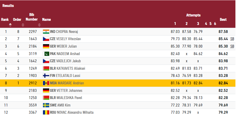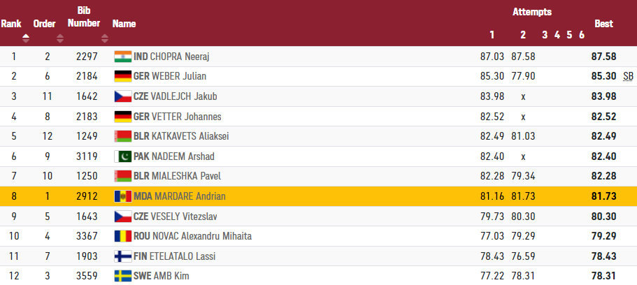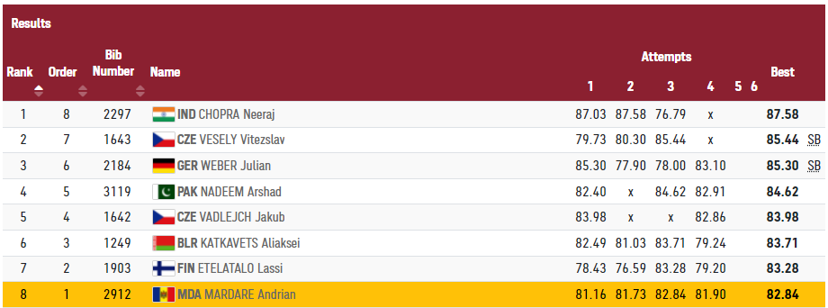 Not much power behind Weber's throw, 83.10m in his fourth attempt, his best still 85.30. Vesely, on second, with an invalid throw in fourth attempt. His best so far is 85.44.