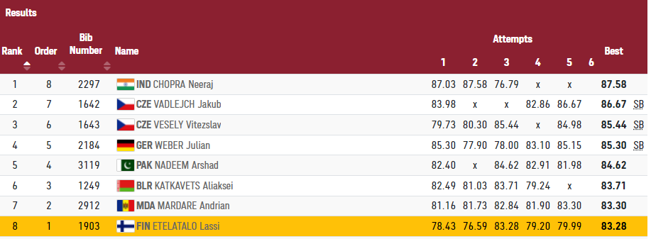Eight athletes are done with their throws. Neeraj still at top with 87.03m. Second is Germany's Julian Weber. Johannes Vetter starts off with 82.52.